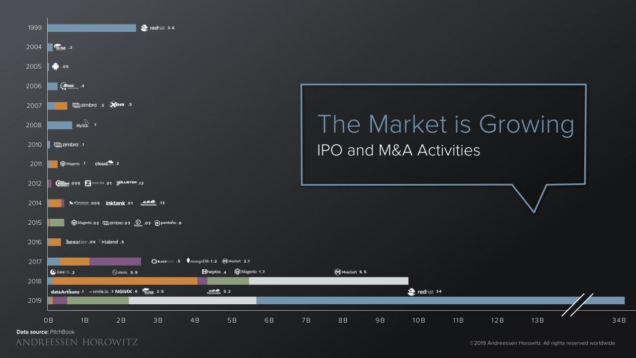 不过,看看过去几年都发生了什么。我们有 Cloudera、MongoDB、Mulesoft、Elastic 和 GitHub,它们都是数十亿美元 IPO 或并购交易的一部分。当然,还有红帽。1999 年,它以 36 亿美元的价格上市,今年,它以 340 亿美元的价格卖给了 IBM。未来,我非常希望看看是否还会再创新高。