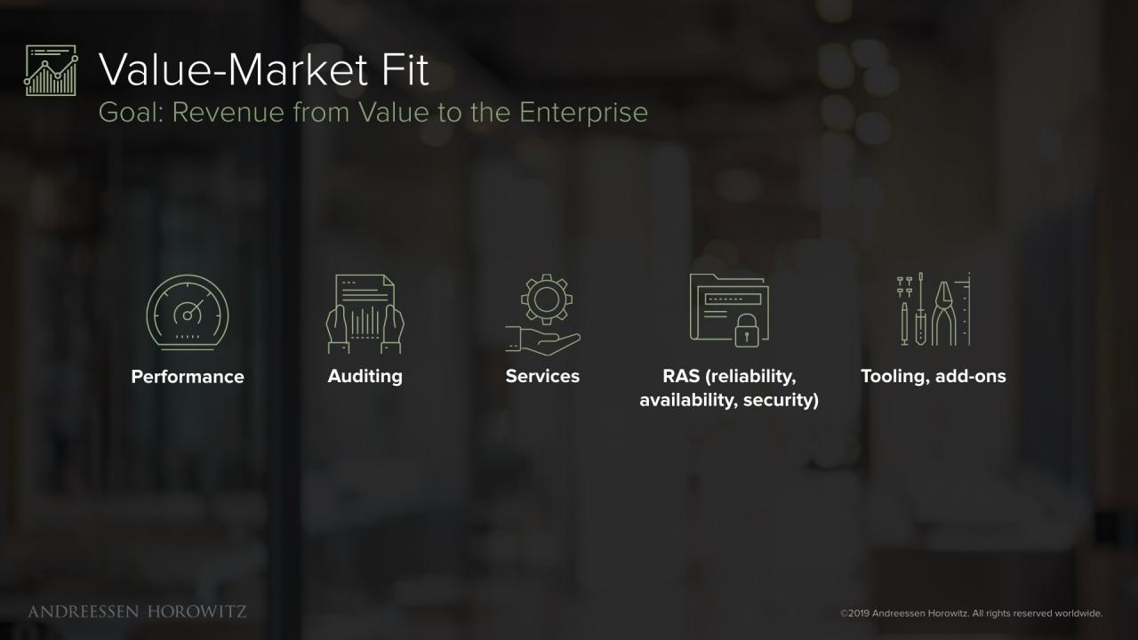 最后一个阶段,通常也是最困难的阶段,是找出价值——市场契合度并创造收入。产品——市场契合度通常由个人用户获得,而价值——市场契合度通常以部门和企业买家为中心。价值——市场契合度的秘诀在于关注客户关心什么、愿意为什么付钱,而不是你能从什么中赚钱。