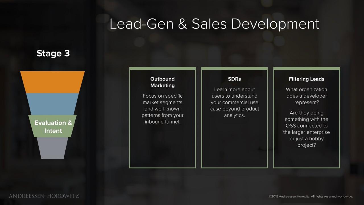 漏斗的下一个阶段——评估和意向——关乎验证和完善潜在客户 & 业务拓展的相关理论。目标是通过潜在客户( sales qualified leads,缩写 SQL)的成功度量,找到从用户到企业买家的成功之路。