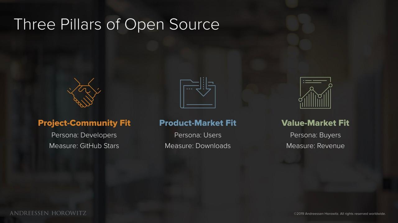 开源企业的成功建立在三大支柱之上。它们起初是展开为一个接一个的阶段。在一个成熟的公司里,它们会成为支柱,要想企业可持续发展,就需要保持和平衡: