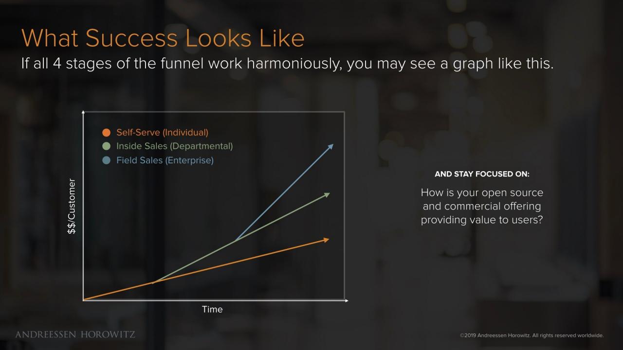 如果成功了,你可能会看到类似上面的图表。y 轴是每个客户带来的收入,x 轴是时间。这张图是我作为 GitHub 前董事会成员时直接观察到的,它显示了自顶向下和自底向上的销售,因为它们的收入是聚合在一起的。这里的要点是:如果你的收入看起来像一个分层的蛋糕,这是一个好迹象。橙色的线是来自个人的自下而上的收入,通常会有这样一条收入线。下一条收入线可能是销售给部门买家,但这是自顶向下的,通常使用内部销售。分层蛋糕的下一部分是现场销售,或直接销售,在整个企业中销售或扩展帐户。为了优化每一条收入线,不要随意进行销售活动;找一个拥有特定职能并有目的地推动这项工作的人。