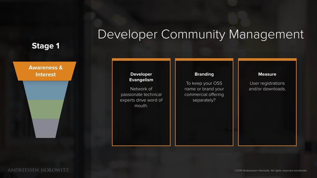 推动开发人员口口相传——通过用户注册和下载量来衡量——对于该漏斗后期阶段的成功至关重要。在公司成立之初,创始人往往是这个时期的第一批传道士。随着公司的扩张,拥有一支由既具备专业技术又具有强大沟通技巧的开发传道士组成的专门团队是非常重要的。虽然这通常是一个罕见的组合,但当一个人同时具备技术和沟通技能时,往往很容易被发现。一旦你发现了这样的开发人员,雇佣他们,让他们在会议和社交媒体上与开发者社区交流,并解释你的项目的重要性和价值。