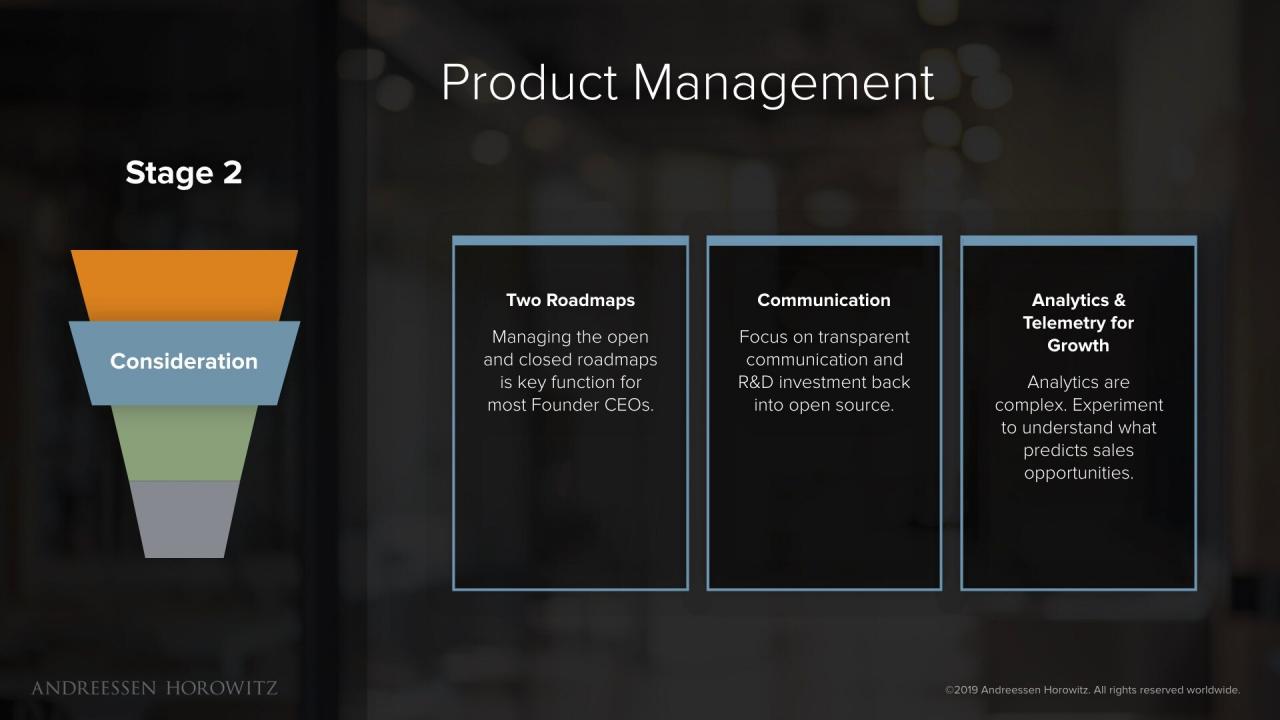 有效的产品管理将行使许多职能来支持这个阶段:管理闭源路线图和开源路线图,与开发人员和用户交流决策,在产品中构建分析功能以收集更多关于使用模式的信息并预测销售机会。