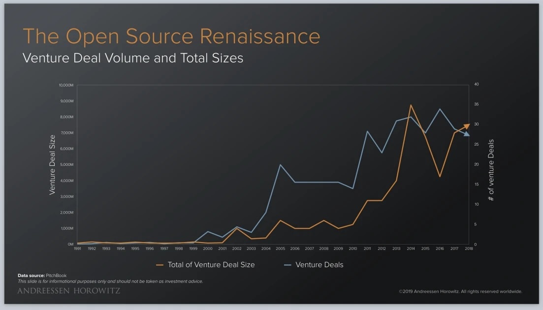 过去的十年是开源的复兴。上图展示了过去的 30 年里,大约有 200 家公司是以开源技术为核心的。这些公司总共筹集了超过 100 亿美元的资本,在过去 10 年里,它们的交易规模越来越大。事实上,四分之三的公司和 80% 的融资都是在 2005 年后完成的。我认为我们正处在这一复兴的开端。