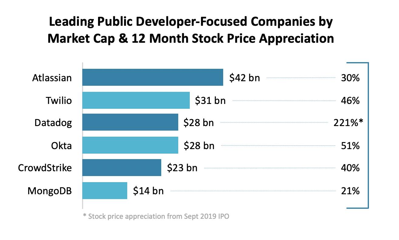 这是企业软件价值创造的合乎逻辑的下一步。一系列由开发者驱动的软件公司——从诸如 Twilio、Atlassian、Datadog、Okta、Crowdstrike 和 MongoDB 等公共领导者到包括 Stripe、Snowflake 和 HashiCorp 在内的即将上市的独角兽公司,一系列开发者驱动的软件公司的市值已达数十亿或数百亿美元。